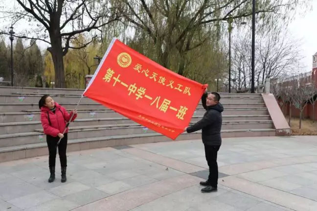 在南山公园分担区内,区慈善总会还为爱心天使义工队第十一中学一八届一班小分队进行了授旗仪式,义工分会副会长高雨为第十一中学一八届一班小分队授旗,慈善义工宋庆洋领誓“义工誓词”。班主任裴丽萍在接到队旗后表示,今后要带领自己的学生们珍惜这支小分队,用热心奉献社会,用真情温暖人心。